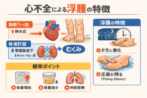 | 解説 | 心不全に伴う浮腫は、主に静脈うっ血と体液貯留によって生じる。 心不全の浮腫は重力依存性であることが特徴で、立位・座位が長い場合は下肢に、臥床時間が長い場合は仙骨部に出現しやすい。そのため日中に下肢浮腫が増悪し、夕方に目立つことが多い。 また、体液貯留による浮腫では、指で圧迫すると水分が移動するため圧痕性浮腫(pitting edema)を呈する。これはリンパ浮腫や炎症性浮腫との重要な鑑別点となる。 看護師のアセスメントでは、浮腫の有無だけでなく、体重変化、尿量、呼吸状態、頸静脈怒張、肺音などを併せて評価することが重要である。特に短期間での体重増加や呼吸苦の増悪は、心不全悪化のサインとして早期対応が求められる。 |